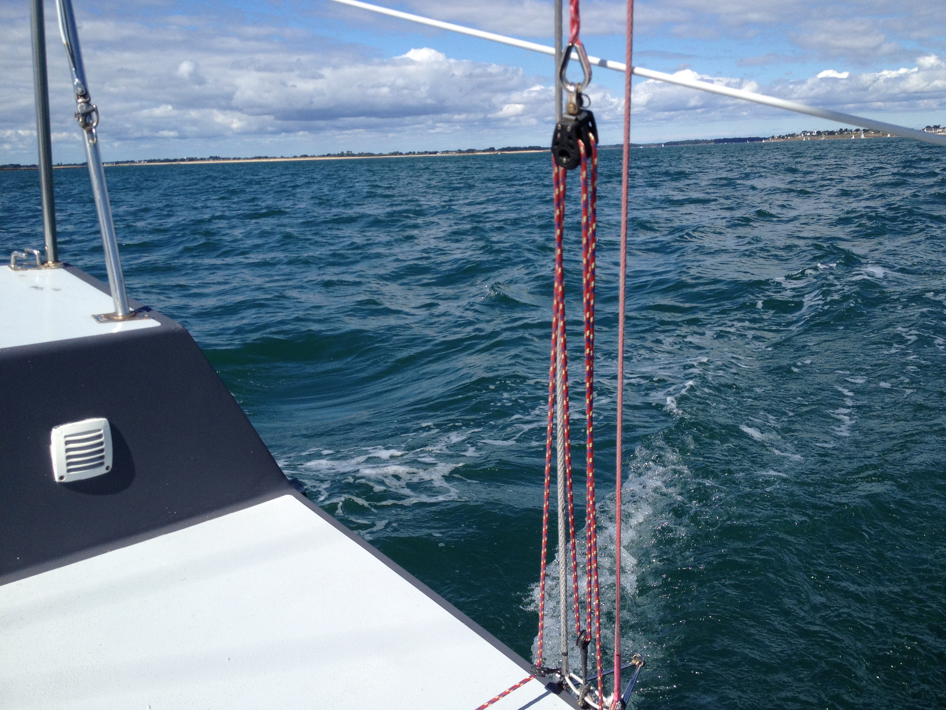 Départ du Crouesty bord de largue vers Méaban sous code 5, vitesse moyenne de 7,3 noeuds. Bord de près vers la plage du Fogeo avec des pointes à 6,9 à 40° du vent sous Solent. Prometteur.