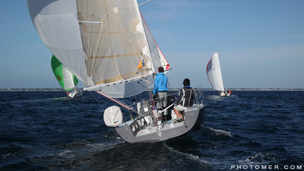 Sentant le vent monté, nous décidons de grée notre Solent en remplacement du génois. La longue remontée auprès vers Sud Méaban voit nos concurrents revenir vers nous, notre choix de voile d’avant ne semble pas judicieux, mais nous gardons notre avantage et passons Sud Méaban en tête. Bord de reachning vers Chimère, 3 concurrents reviennent sur nous, plus puissant et ayant gardé leur génois, notre manque de puissance nous pénalise. A chimère, Téthys, un Elan 31 nous passe, nous passons en seconde place, que nous conserverons jusqu’à la balise l’Epieu.