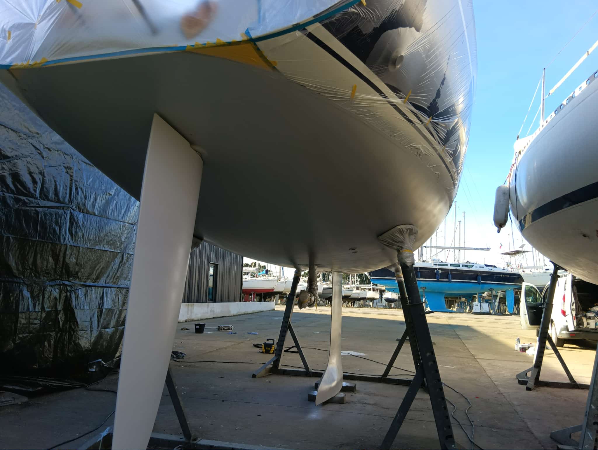Première étape majeure du chantier : la réfection complète de la carène. Après une inspection approfondie, des travaux de reprise de stratification ont été réalisés afin de corriger les zones sollicitées au fil des saisons.