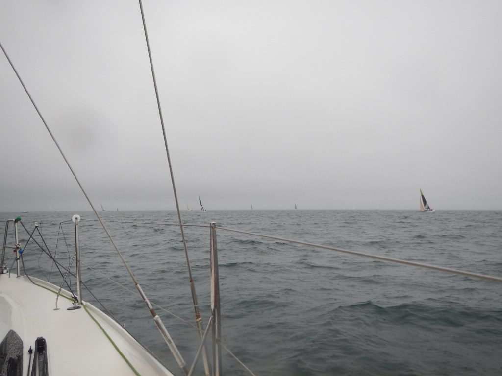 Cette édition s’annonçait brumeuse et pluvieuse et les prévisions étaient justes. C’est donc en ayant l’impression de partir pour une session d’entrainement d’hiver que nous avons quittés le port du Crouesty en ce matin du 11 août nous orientant grâce à la cartographie pour trouver la ligne de départ mouillée au milieu de la baie de Quiberon.