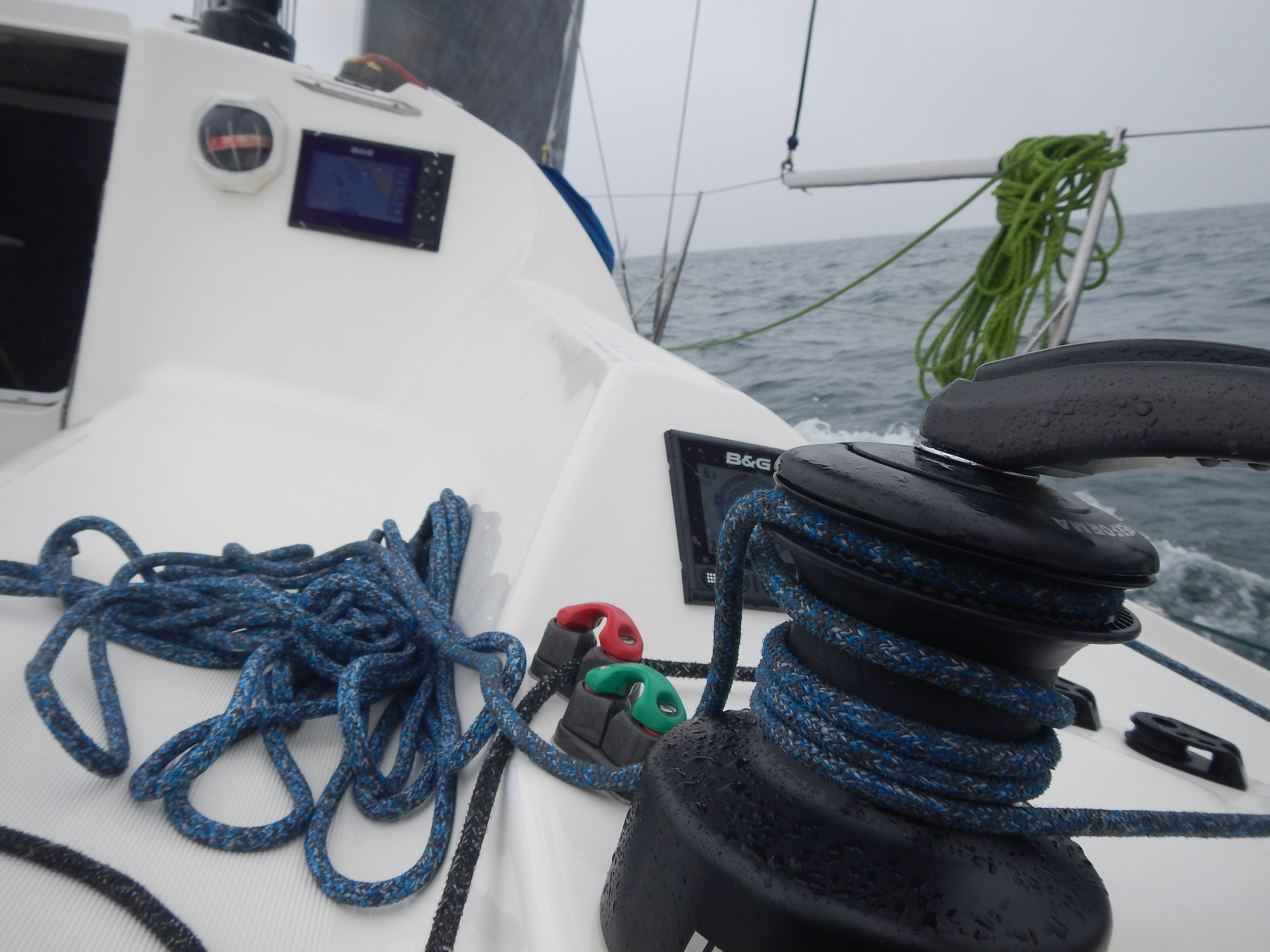Deux manches de courues sous un ciel menaçant puis une pluie assez forte et présente toute la fin de journée. Côté vent, une brise de 10 à 15 nœuds nous a accompagné toute la journée.