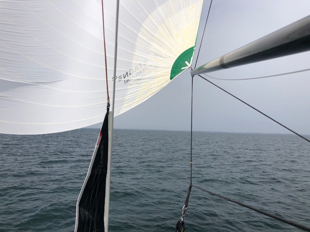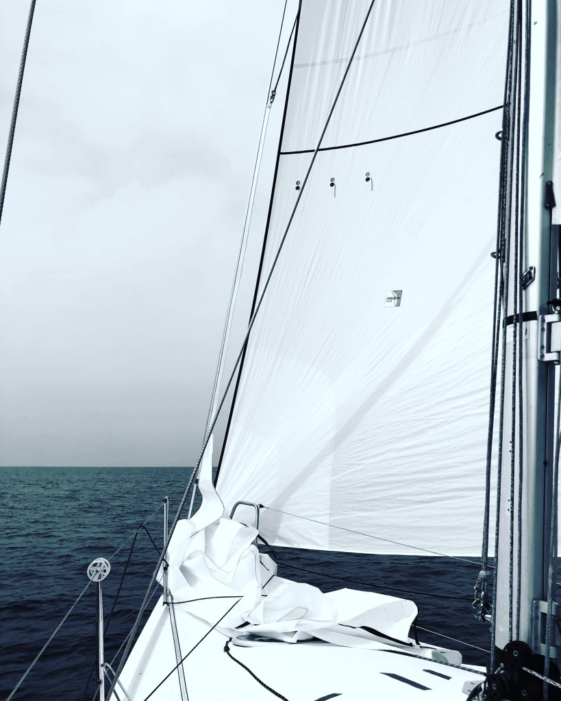 Nous nous mettons vent arrière, luttons quelques minutes pour enrouler le spi sur lui-même, heureusement qu’il n’y a que 10/12 nœuds de vent car la lutte est âpre. Je n’ose imaginer la même situation le mardi dans 20 nœuds de vent.