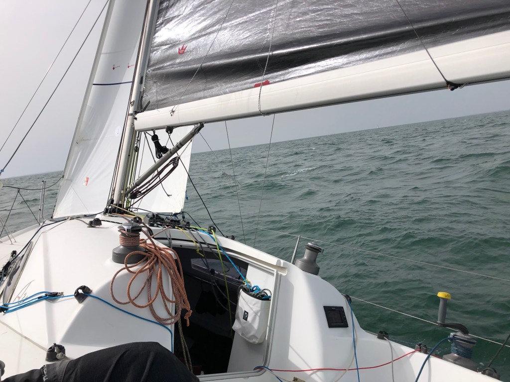 Au près nous prenons nos marques et cherchons de la vitesse, au portant sous grand spi, nous glissons bien. Sur un long bord de travers nous essayons notre Code mais ne trouvons pas les bons réglages. On se fait passer par plusieurs bateaux.