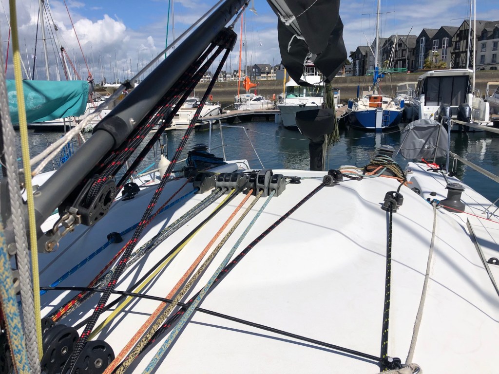 Maté et réglé par Gréement System (http://greement-systems.com/), notre mât a été parfaitement préparé. Restait à mettre en place l’amure du Code, les lazy-jacks et à reprendre certains éléments sur le pont: