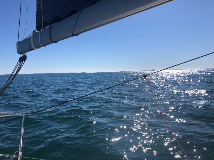 En ce deuxième jour de course, faute de vent, nous démarrons au moteur pour traverser la baie de Quiberon et passer la Teignouse.