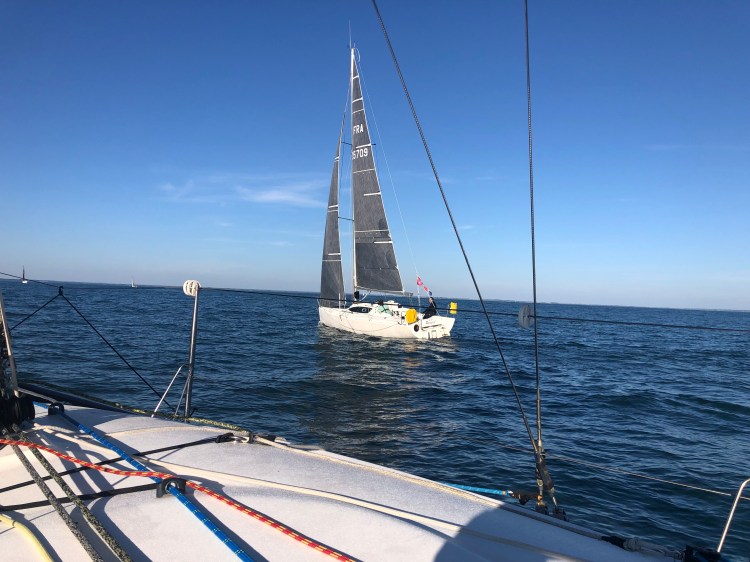 Mais avant cela, au départ de Lorient, il aura fallu être malin pour ne pas se faire pièger par la pétole qui sévit près d’une heure durant après le départ. Nous reculons, comme bon nombre de nos adversaires. Ca rentre à droite, comme prévu, ceux à la côté, sur Groix, touchent le vent en premier et passe les Chats. Notre groupe suit un peu plus loin. Nous sommes malgré tout bien entourés, c’est un départ chaotique mais on réussi à repartir avec un groupe assez dense. On est pas en queue de flotte.