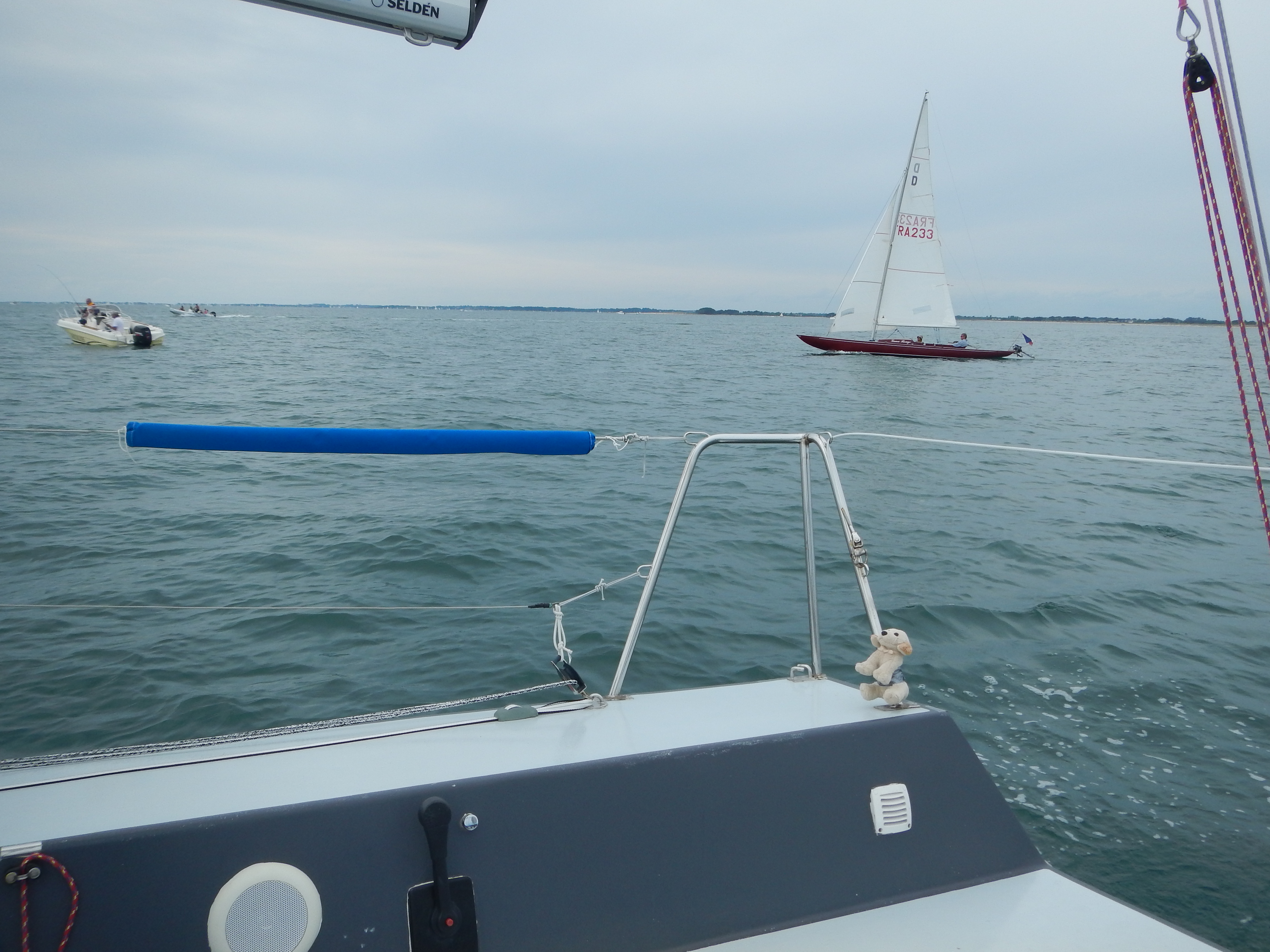 Frustration compensée par la dernière manche (écourtée faute au vent qui nous a gratifié d’une rotation de 40°) et ou nous sommes partis en tête, seul au comité quand tous nos concurrents avaient choisi la bouée.