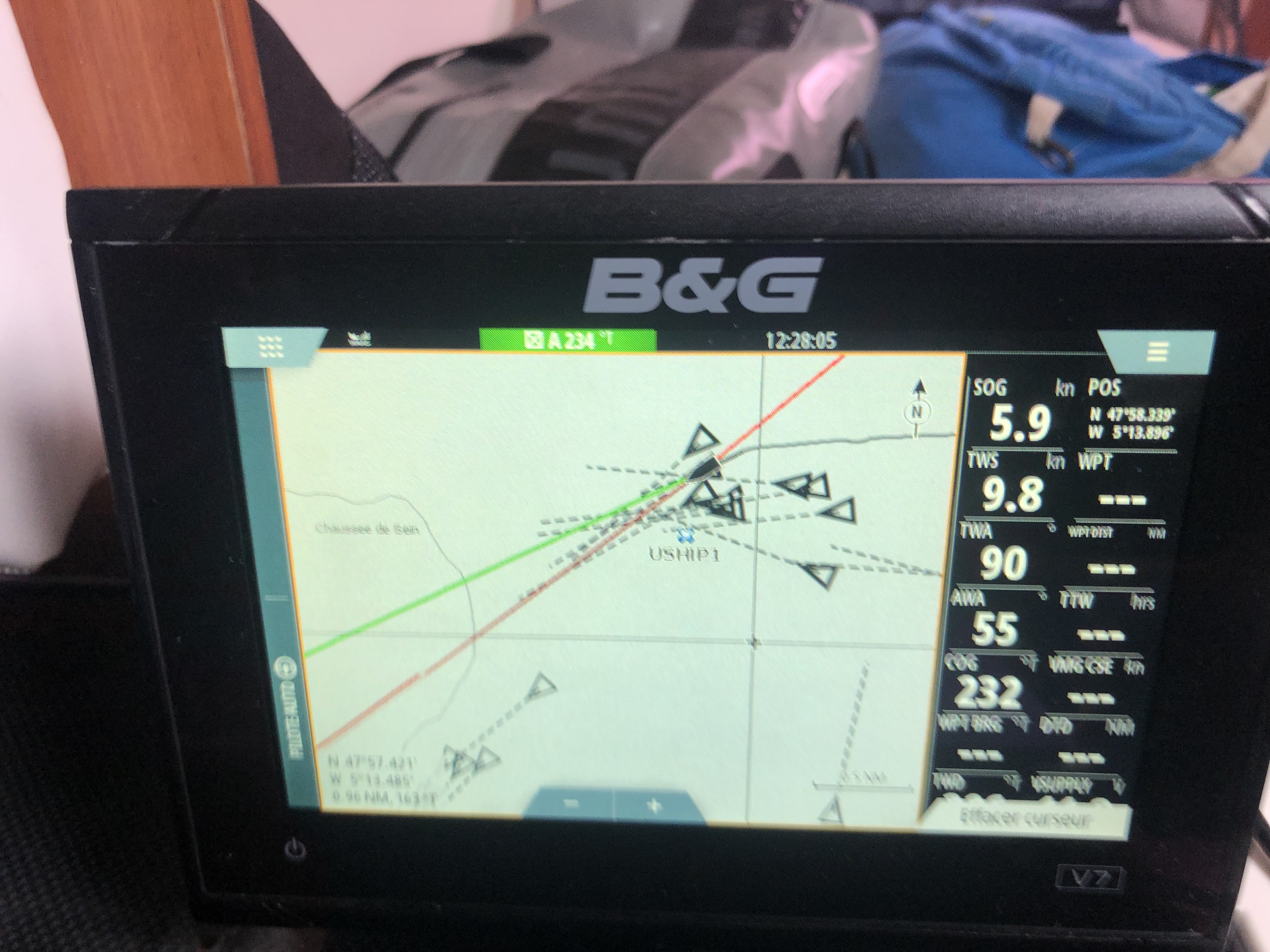Uship 2 est derrière nous, nous envoyons notre S2 (spi symétrique) et entamons notre descente vers Belle-Ile, le vent nous fait d’abord pointer note étrave vers Penmarch, mais le vent doit prendre de la droite et nous emmener progressivement vers Belle-Ile.