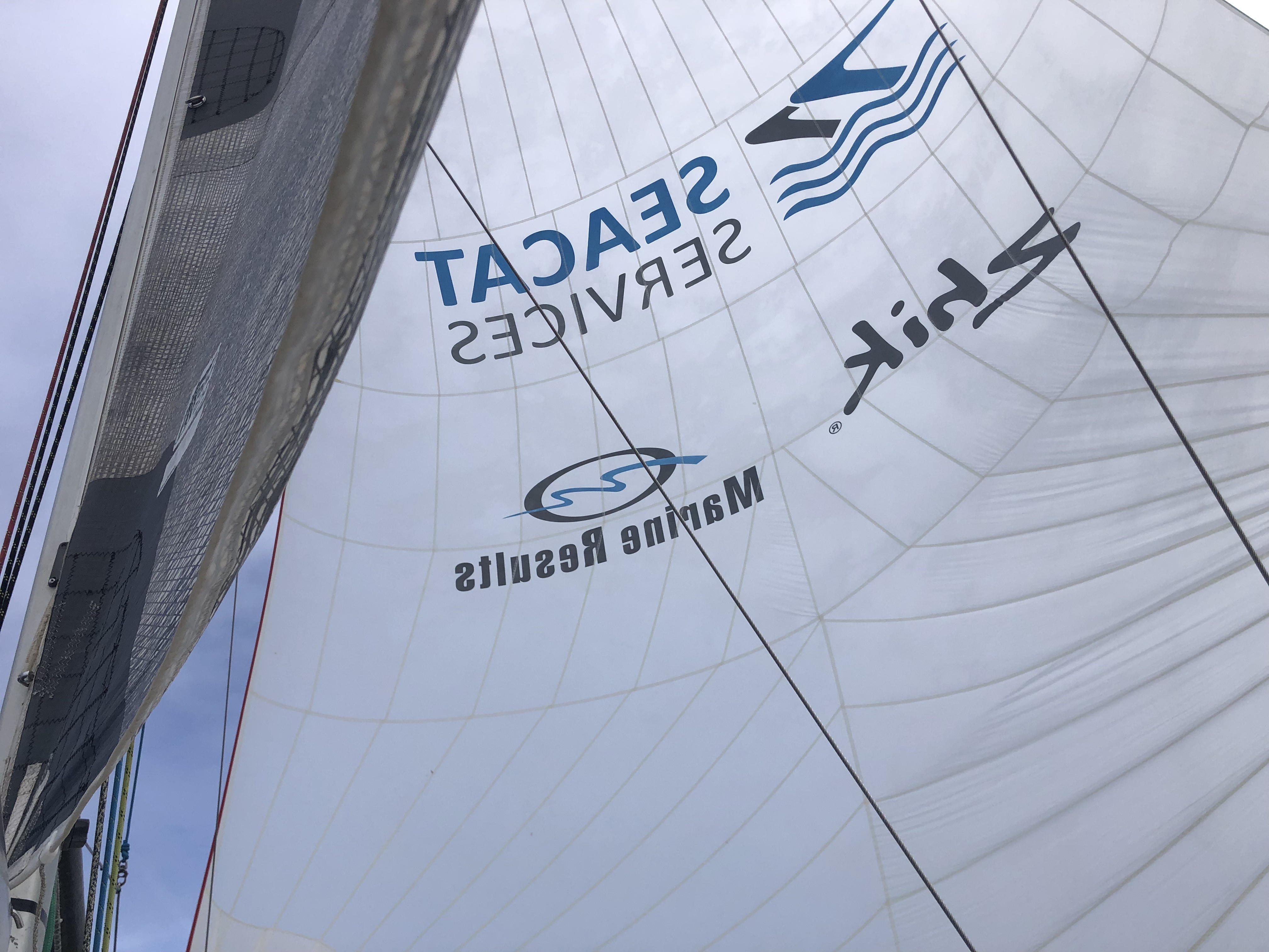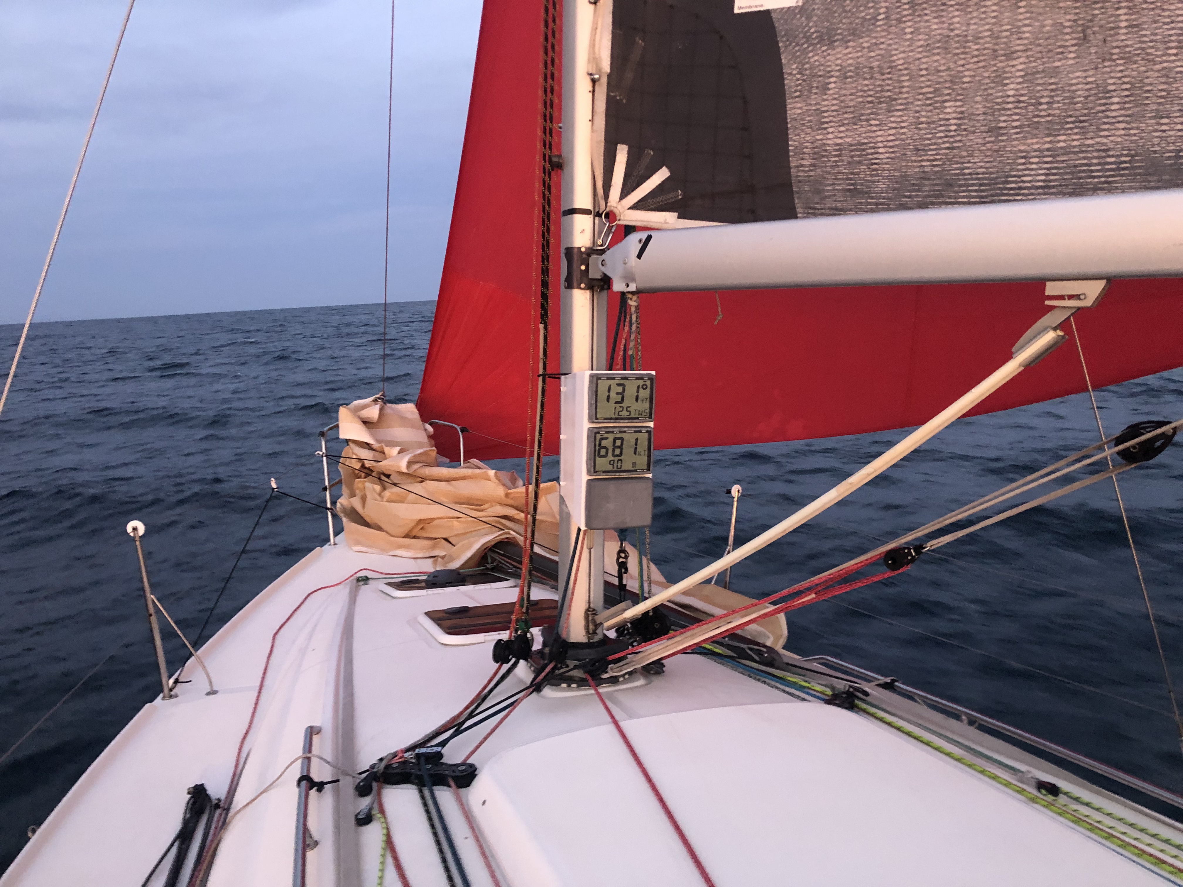 Mais rien ne se passe vraiment comme prévu. Notre bras de spi casse net, s’en suit un affalage obligatoire. N’ayant pas de bras de rechange à bord, nous ne pouvons plus utiliser nos spis asymétriques, nous devons passer sous code 5, un petit spi asymétrique qui fait stagner notre vitesse à 6/7 noeuds quand nous voyons nos concurents avec qui nous étions bord à bord partir à 10/12 noeuds sous spi dans un vent qui se renforce. Dur pour les nerfs d’autant plus que nous voyons les bateaux de derrière revenir inexorablement sur nous sous spi.