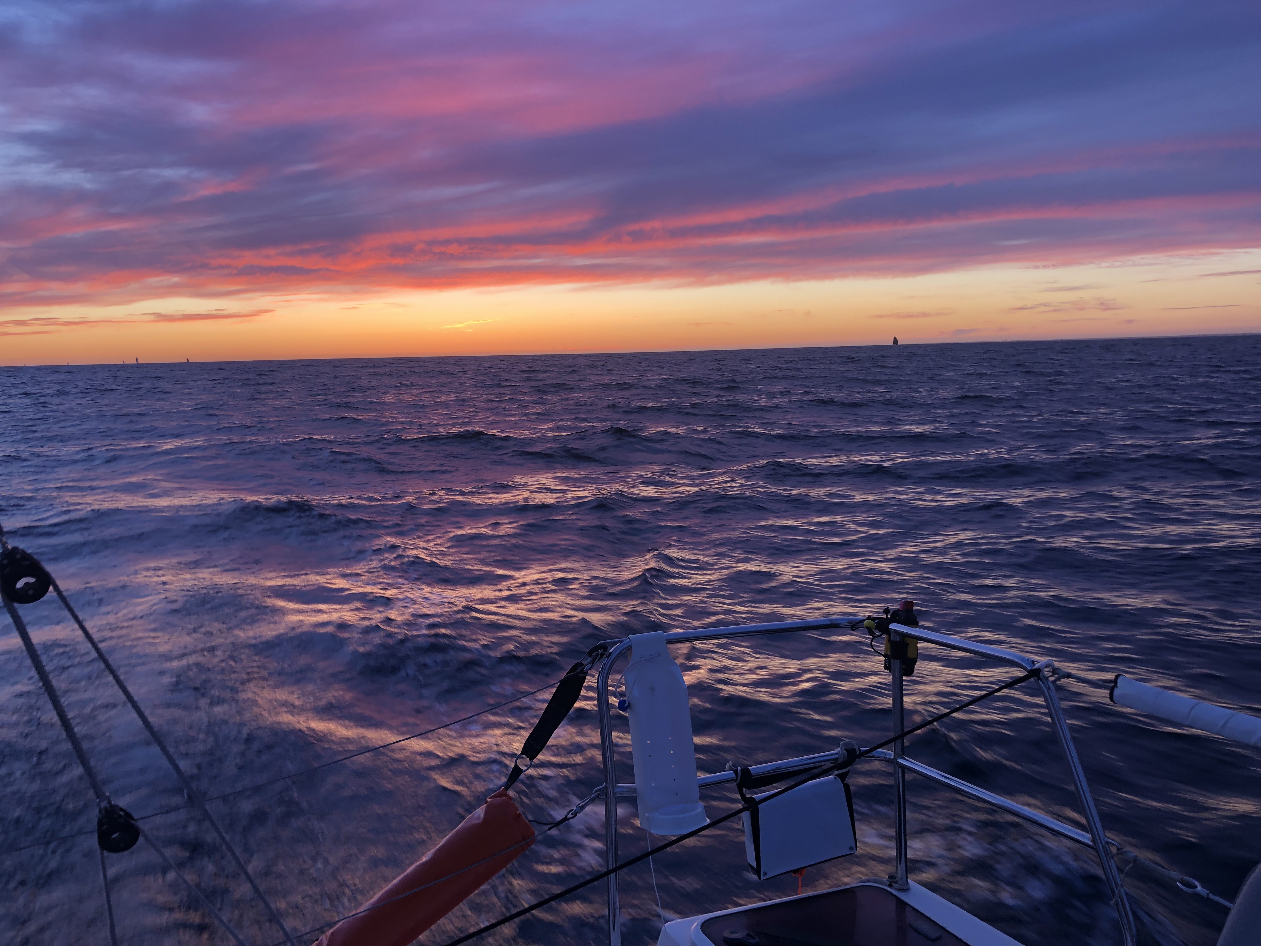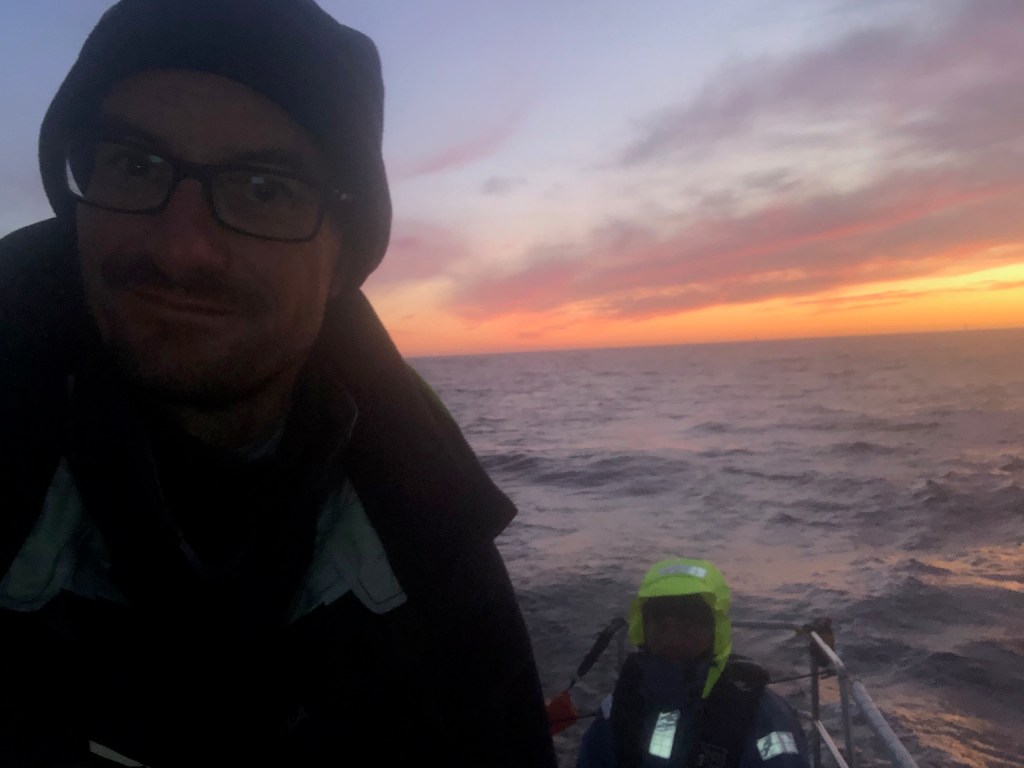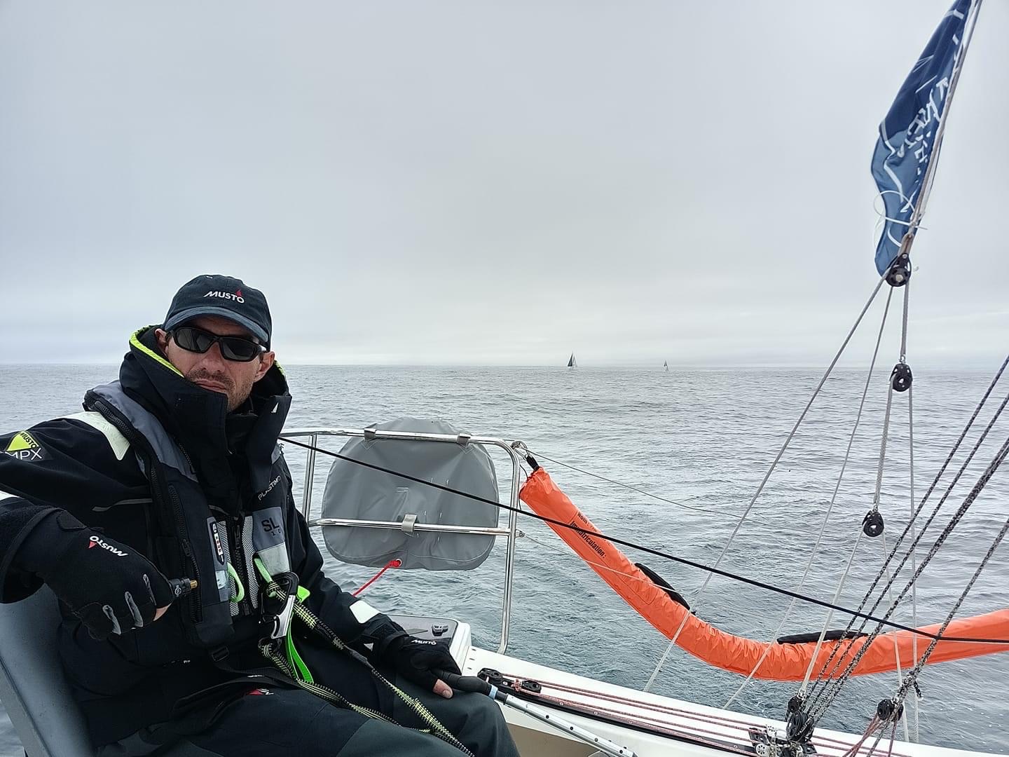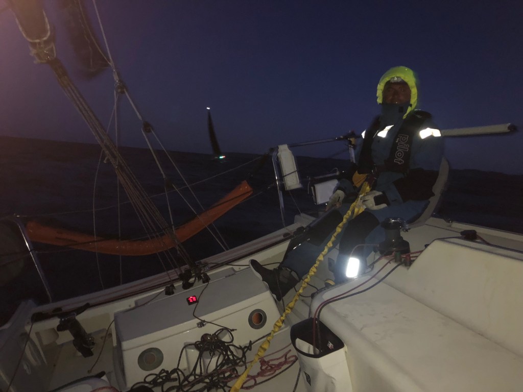 Sur ce bord de près dans une mer agitée de face, nous reprenons 2 ou 3 concurrents. Une nouvelle fois, notre organisation et notre présence à la barre toute la nuit ont sans doute payé et nous permet de recoller à nos camarades que nous avions perdus de vue après la casse de notre bras de spi.