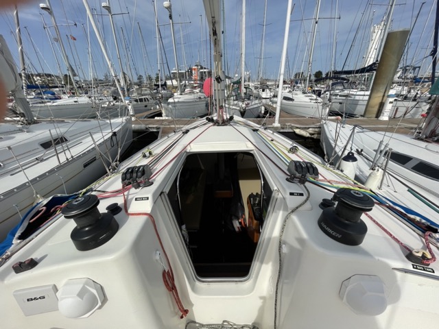 C’est parti sous spi, jusqu’a Sud Méaban, après un bon départ, ce premier bord est plutôt tranquille, nous partons avec 2 autres Sun Fast et un JPK 9,60. Après avoir enroulé Sud Méaban, direction Chimère au près, et là nous constatons un manque de vitesse et de cap (notre réglage de mât continu à nous interroger), nous ne retrouvons pas les sensations au près que nous avions avant de remplacer notre mât.
