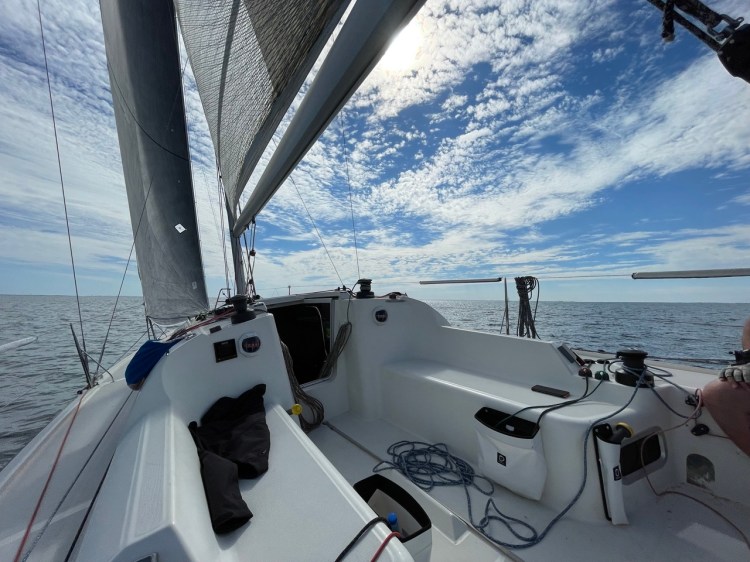 Arrivée à Nord Quiberon, nous remontons au près vers Sud Méaban, nous perdons quelques places dans ce bord de près (promis on va régler ce souci de réglage de mât). Après méaban, direction Chimère au bon plein/reaching, sur cet avant dernier bord, nous nous confrontons comme le reste de la flotte a des zones sans vent ou le bateau est totalement arrêté pendant quelques minutes puis repart. Dur pour le moral. Nous parvenons à Chimère puis nous engageons sur le dernier bord en direction de l’arrivée, spi pas spi? Nous décidons de ne pas envoyer notre spi, comme une grande majorité de ceux qui nous précèdent ou nous suivent. Bonne décision, le vent refuse et nous finissons au près pour atteindre la ligne d’arrivée.
