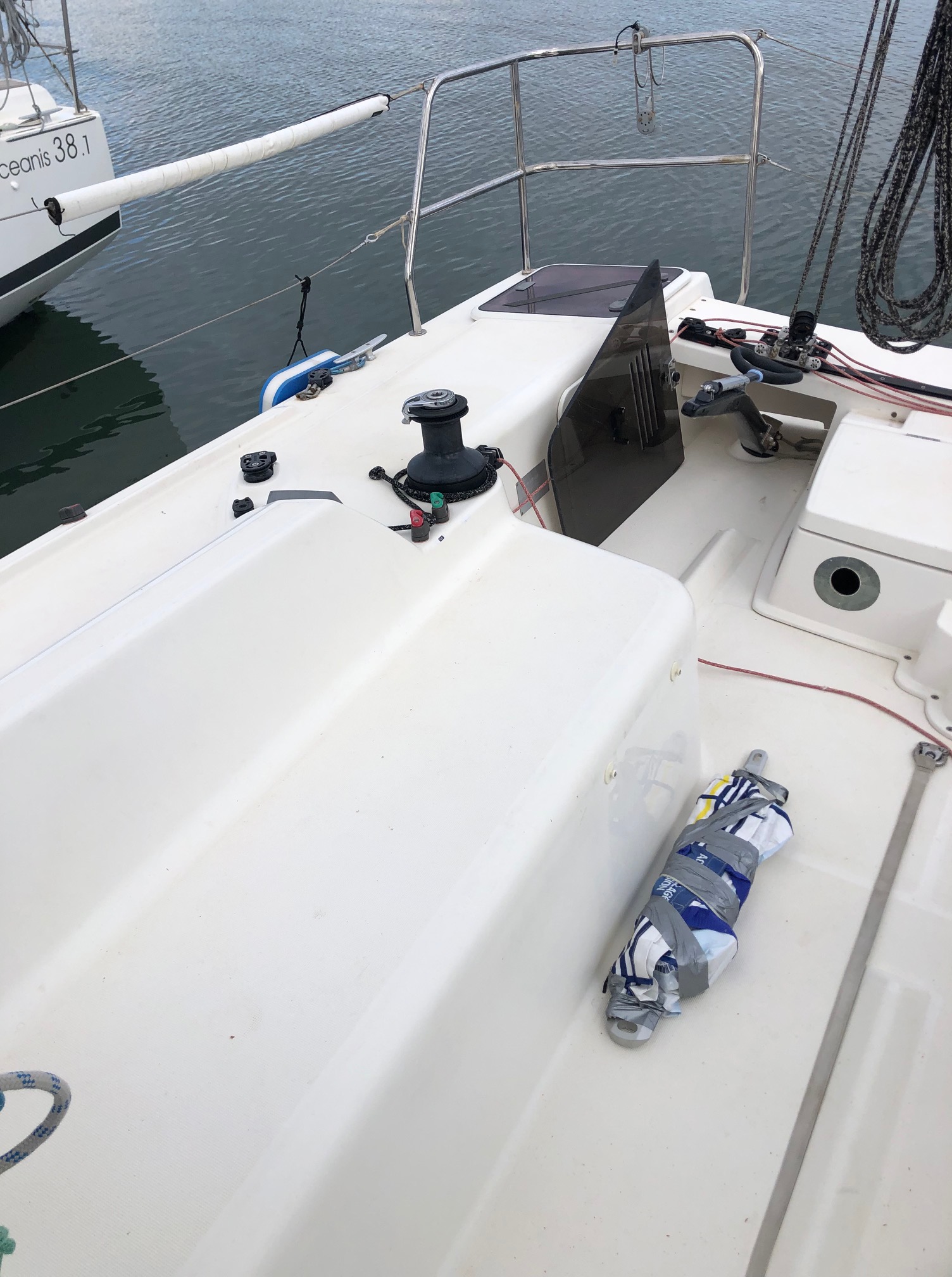 Dimanche 25: Changement radical de temps, du soleil et une très légère brise. Comme le veut la tradition, les départs lors de cette Duo du Crouesty s’enchaine en fonction du handicap de chaque bateau. Nous partons dans le derniers tiers de la flotte. Objectif, rattraper ceux partis avant nous et surtout ne pas se faire reprendre par les bateaux partis après nous.