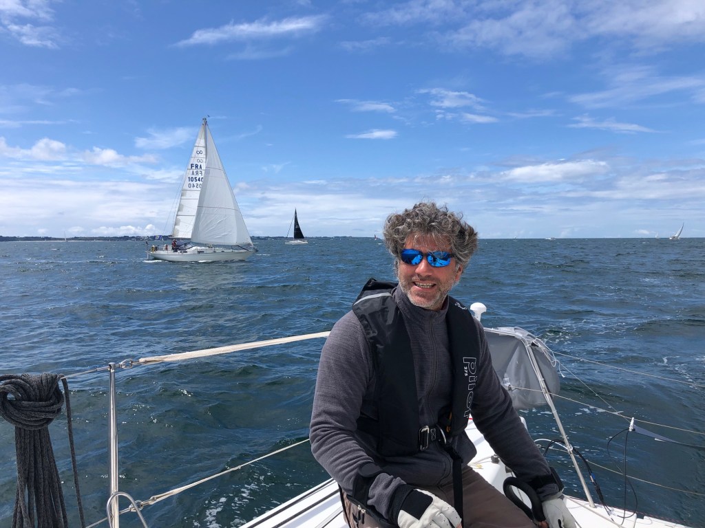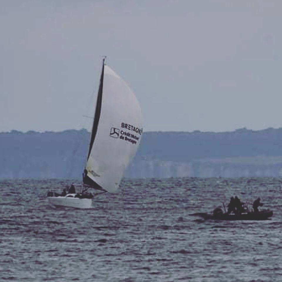 Aurélien assure le départ et la traversée de la baie de Douarnenez sous Code 5 dans une brise très légère.