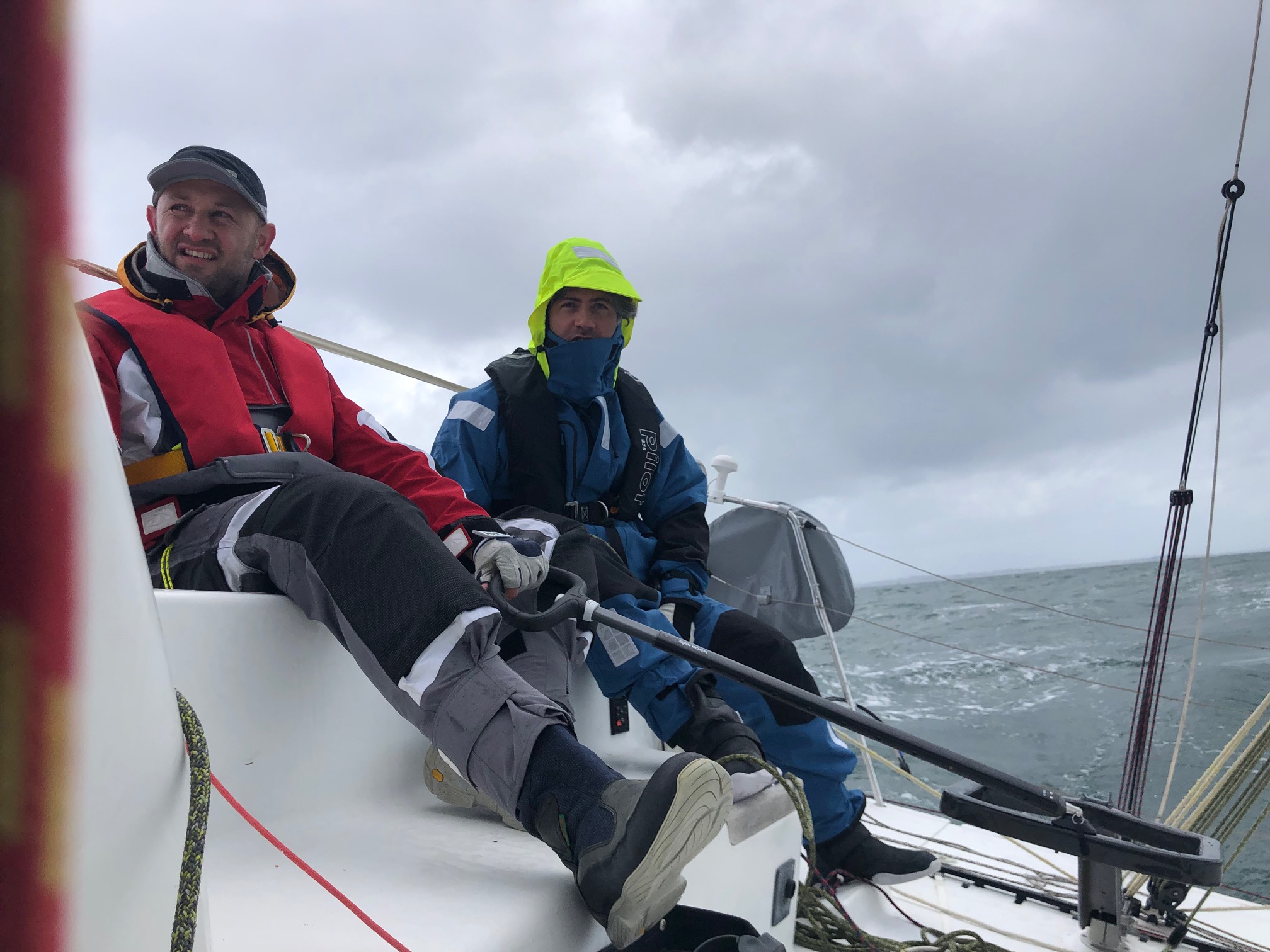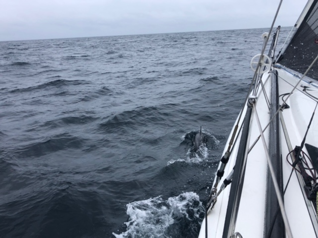 Camaret – Concarneau: Près de 100 milles au près dans un temps pluvieux et une mer courte et abrupte. La rencontre de plusieurs dauphins en Baie d’Audierne a égayé cette journée.