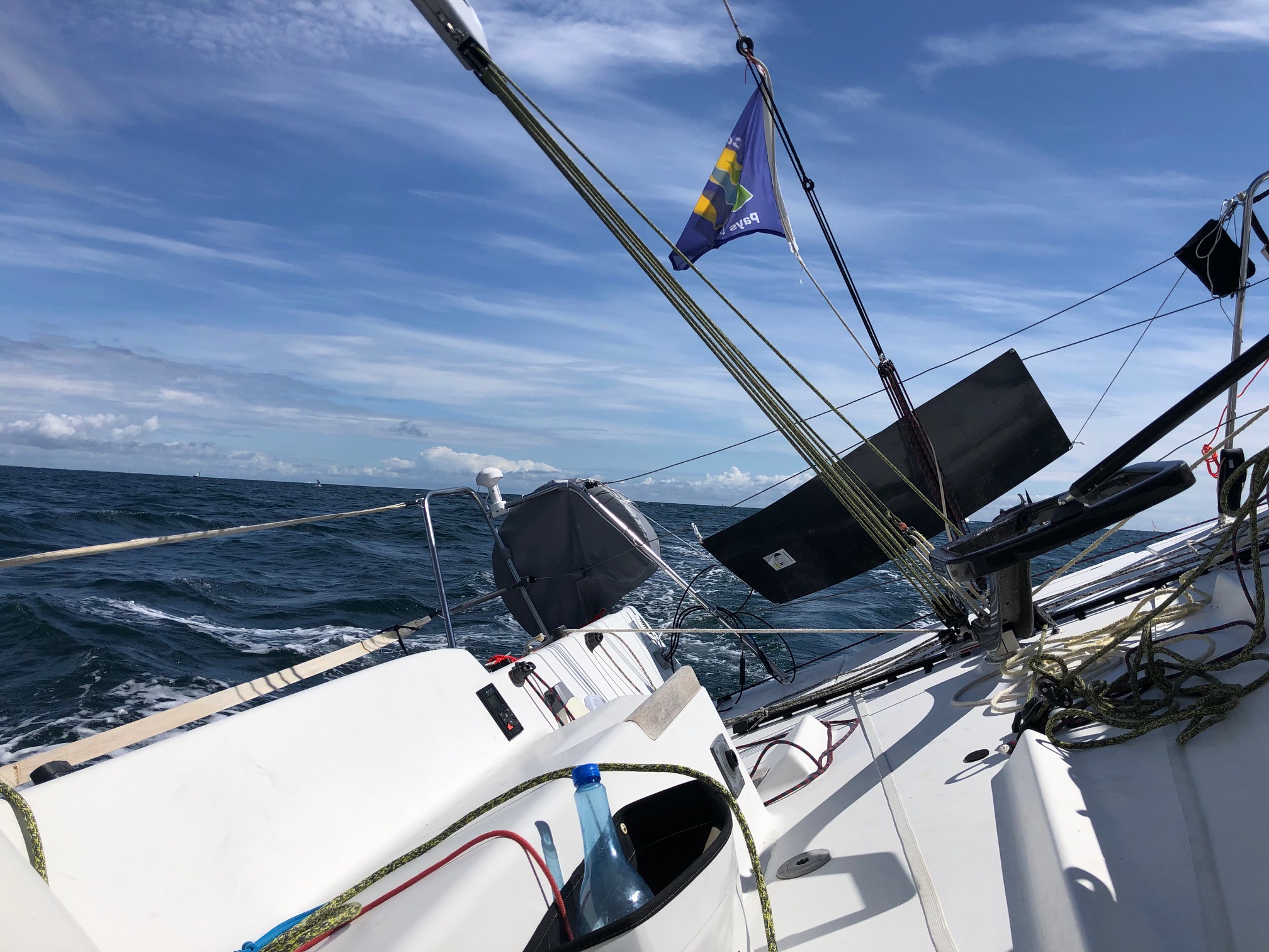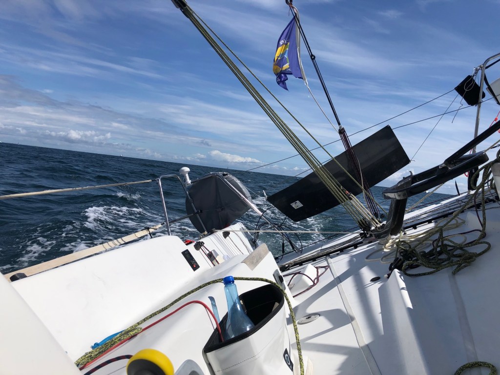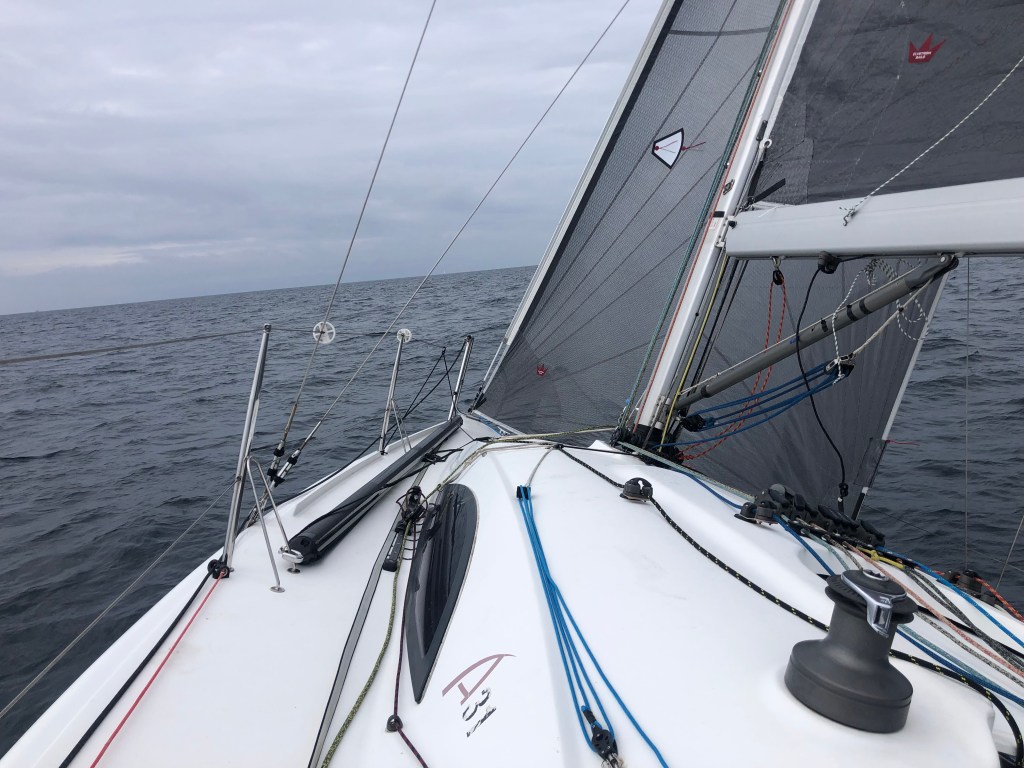 Au près nous prenons nos marques et cherchons de la vitesse, au portant sous grand spi, nous glissons bien. Sur un long bord de travers nous essayons notre Code mais ne trouvons pas les bons réglages. On se fait passer par plusieurs bateaux.