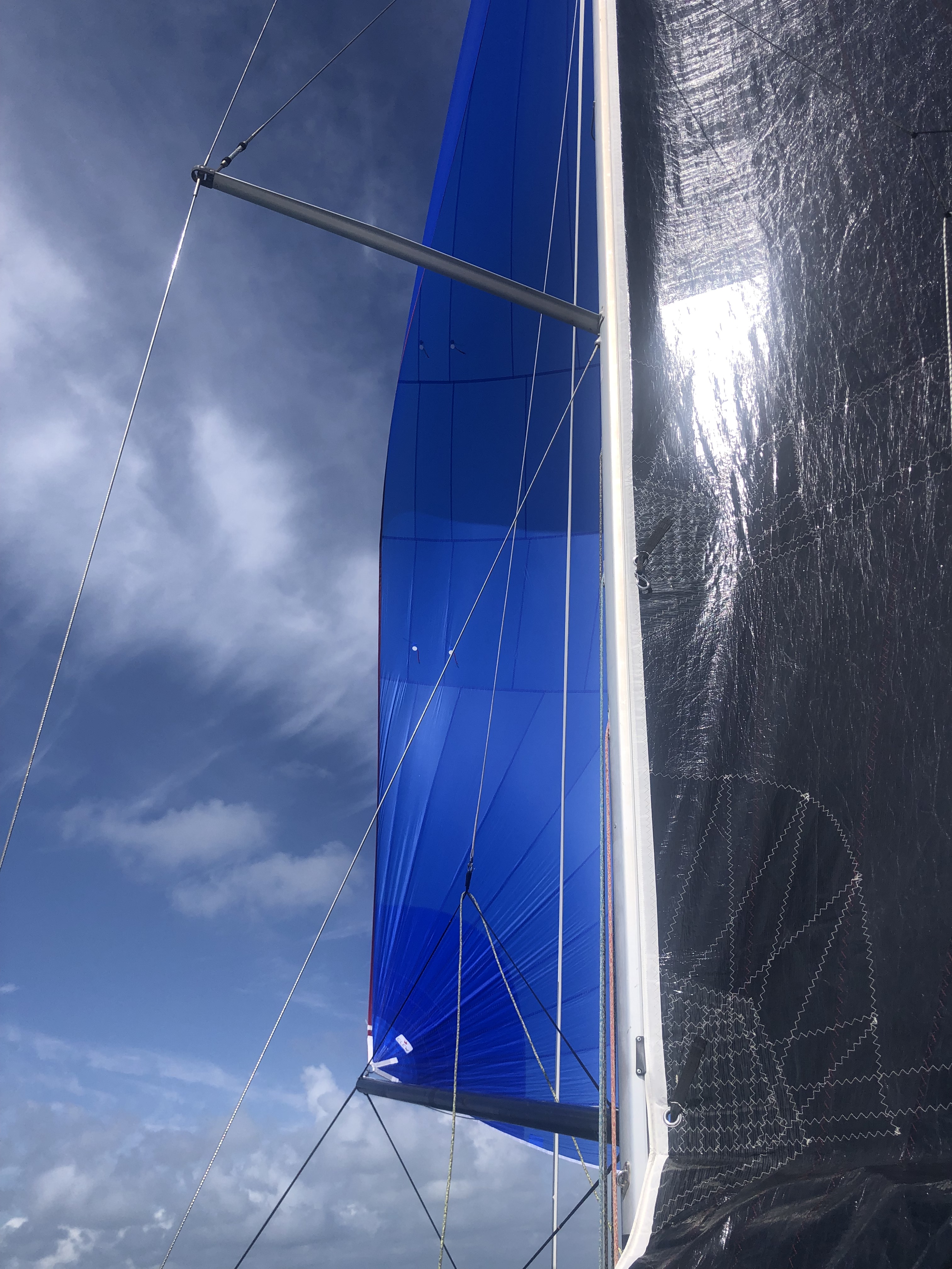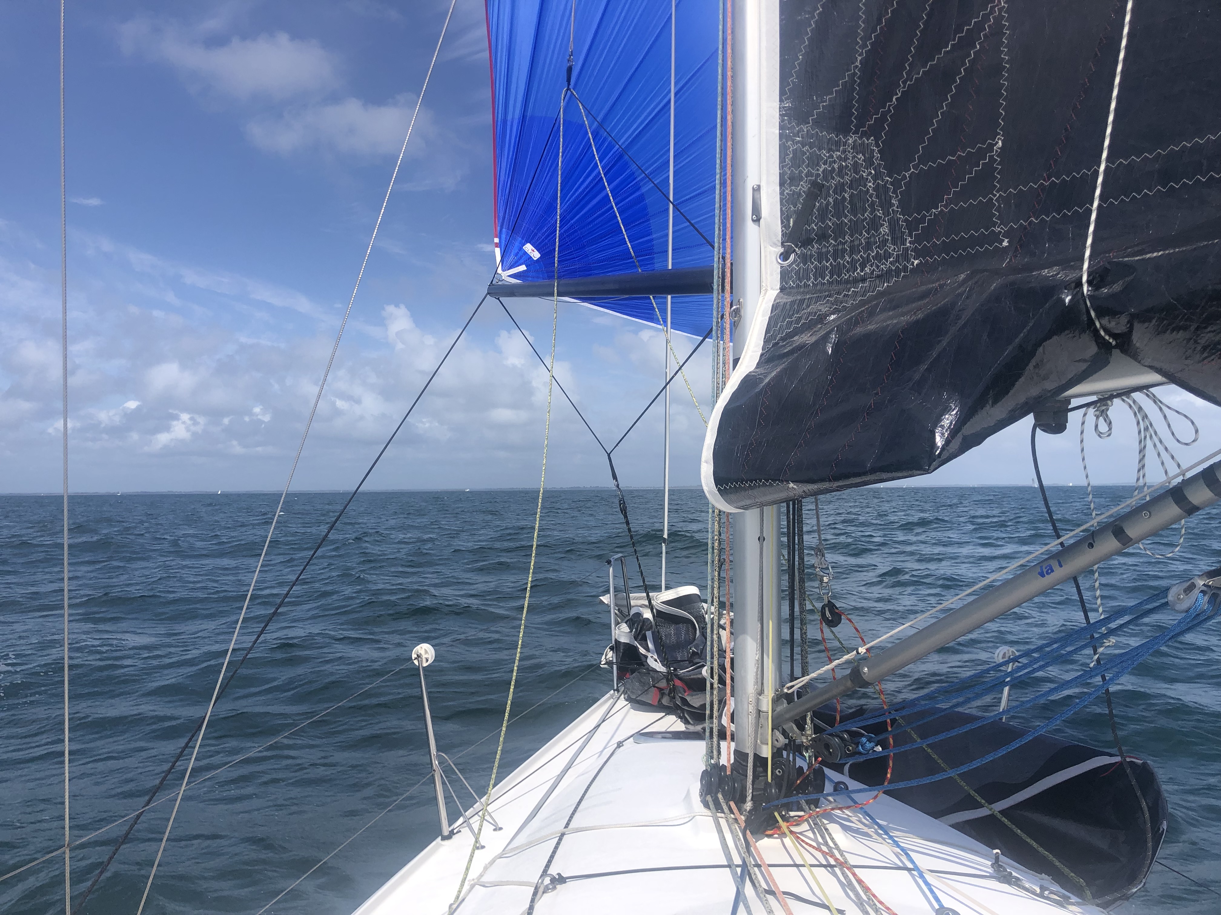Nous nous mettons vent arrière, luttons quelques minutes pour enrouler le spi sur lui-même, heureusement qu’il n’y a que 10/12 nœuds de vent car la lutte est âpre. Je n’ose imaginer la même situation le mardi dans 20 nœuds de vent.