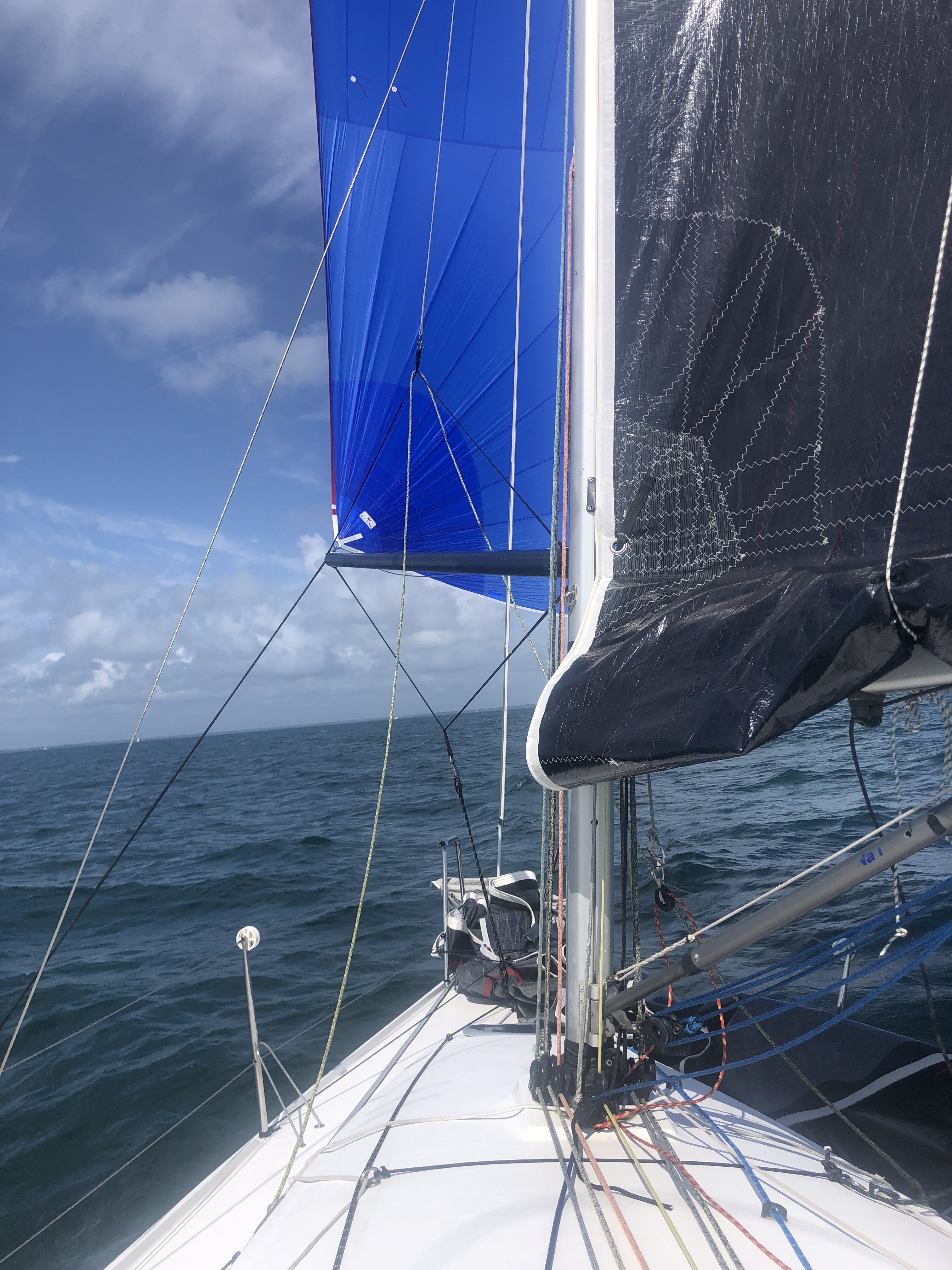 Nous rentrons à Lorient sous voiles et en profitons pour gréer notre Code et en chercher les réglages. En vain. Nous décidons de remiser cette voile pour le reste de la semaine, ne comprenant pas son fonctionnement (après échange avec notre voilier, nous avons ensuite compris que nous n’utilisions pas cette voile dans son bon range.