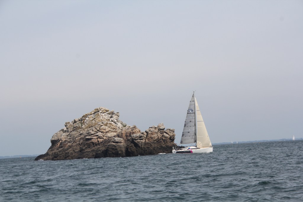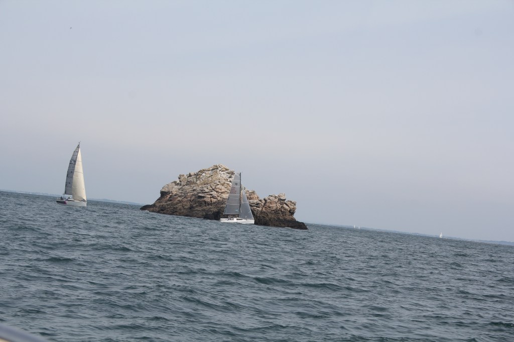 Le samedi, au menu un parcours de 26 milles nautiques dans un vent de 12/13 noeuds au départ qui devait baisser au cours de la journée. Ce beau parcours en baie entre baie de kerjouanno, Sud et Nord Quiberon, le rocher de la Vieille, la recherche et Sud Méban nous aura fait naviguer à toutes les allures. Après un bon départ en 3 ème position, nous maintenons notre position dans le groupe de tête pour arriver 4 ou 5 à Sud Quiberon avant de rejoindre le rocher de la Vieille.