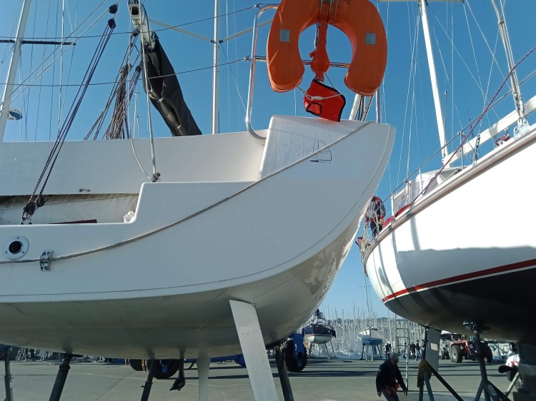 De notre côté, cette période hors-d’eau a été l’occasion de faire un peu de matelotage (nouvelles écoutes de spi et de solent) et de procéder au rangement du matériel obligatoire à bord, sécurité, cambuse, ….