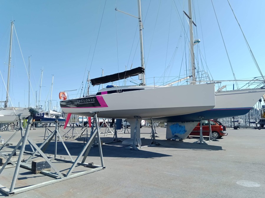 Atelier sur Mer à assuré la fourniture et la pose du covering de coque aux nouvelles couleurs de notre sponsor principal (www.epsilon3d.fr)