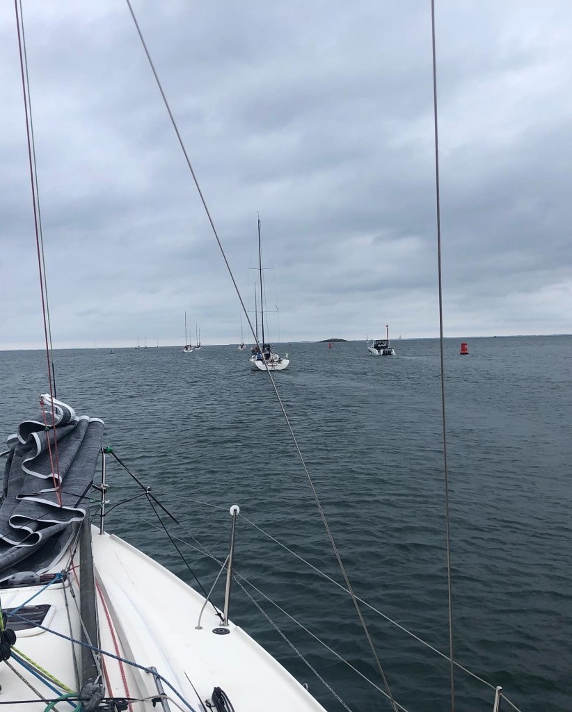 Nous partons donc depuis Sud Méaban, au près, en direction d’une bouée mouillée en baie de Kerjouano. Bon départ avec les mêmes que le samedi, mais dans un bon timing. Au près comme le samedi, peu de cap et un manque de vitesse évident nous bataillons pour rester dans le match mais c’est compliqué.
