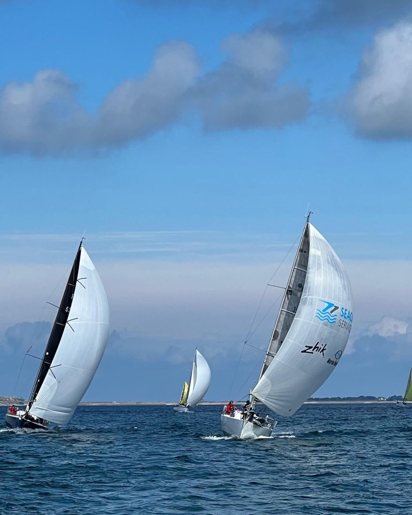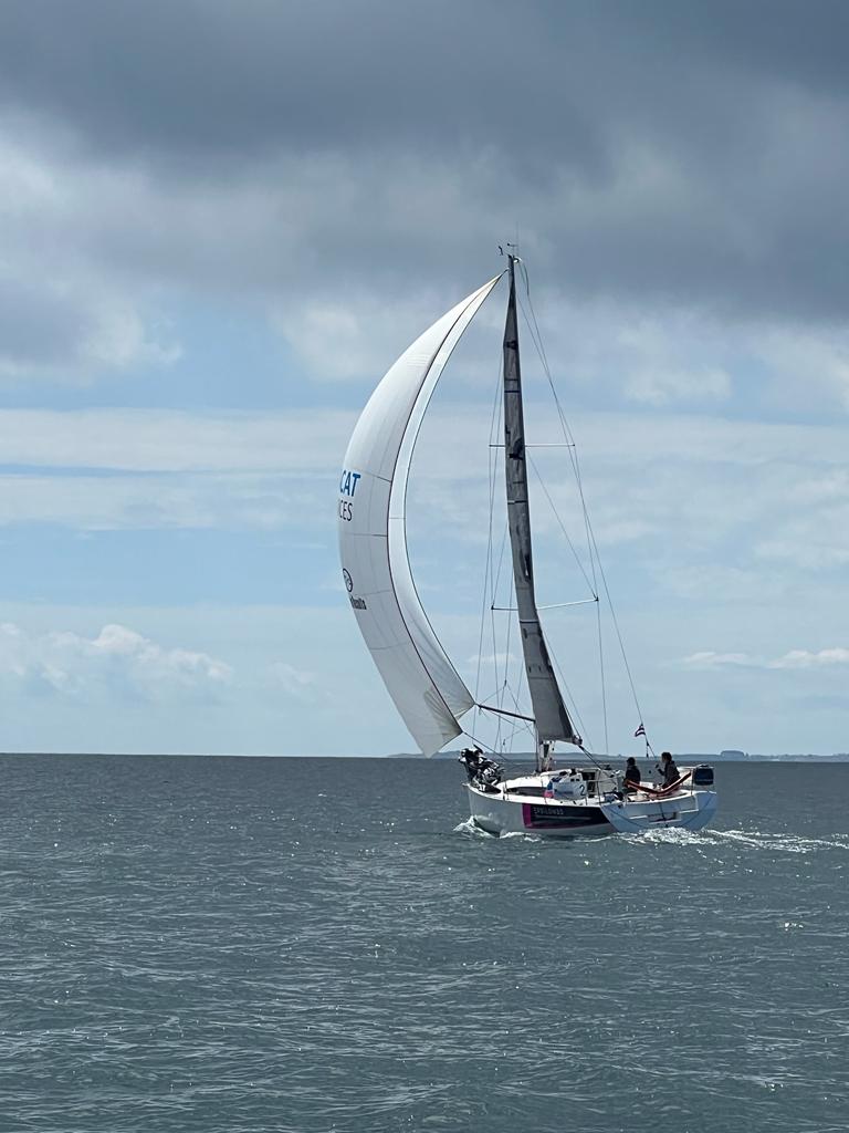 Une fois la bouée enroulée, direction Chimère au bon plein dans un premier temps puis au reaching, notre spi est prêt mais sur le mauvais bord, on change le spi de bord, on envoi, on envoi pas. Certains équipages envoi leur spi mais perdent beaucoup en cap, au reaching par 8/10 noeuds de vent, notre Sun Fast 3200 sous GV et J1 avance bien, on remonte sur l’avant de la flotte et on perd pas sur nos poursuivants.