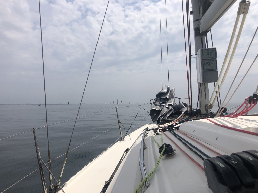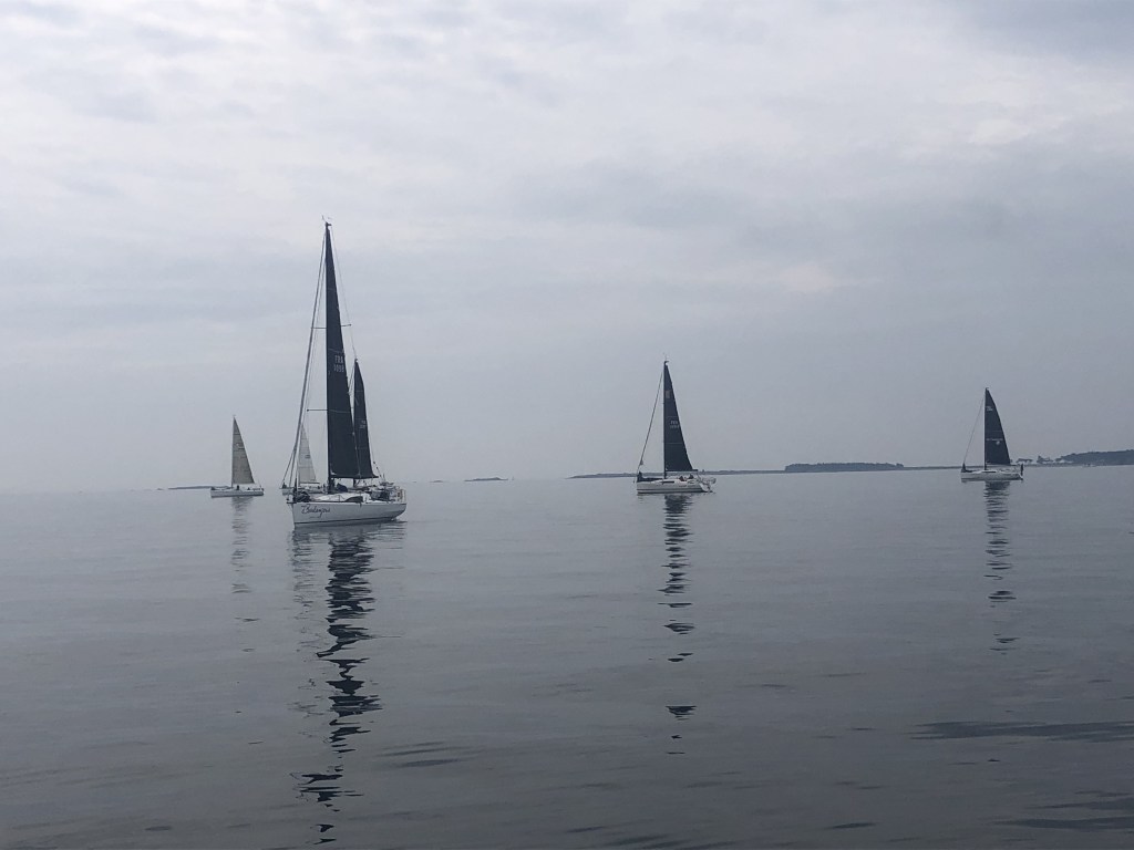 Nous arrivons à la bouée de dégagement avec une dizaine de concurrents derrière nous, nous partons au bon plein vers la prochaine marque quand une partie de la flotte part sous spi, au travers. Que font-ils à 45° de la route directe? En fait, toute cette partie de la flotte avaient anticipée une rotation du vent qui leur permet de rejoindre la marche sous spi, avec plus de vitesse, quand nous avons démarré notre bord plus loffé (près du vent) et moins rapide. Nous passons rapidement sous A3 (spi Asymétrique) puis sous S2 (spi symétrique) mais le mal est fait et nous regardons ceux partis très tôt sous spi nous mettre une distance que nous ne récupérerons pas. Pire, le vent baisse à l’approche des Birvidaux laissant l’opportunité aux derniers bateaux de recoller avant que…. le vent ne s’efface totalement obligeant le comité de course à sonner la fin de cette manche avant l’arrivée pour établir un classement au point de passage des Birvidaux.